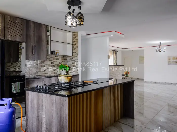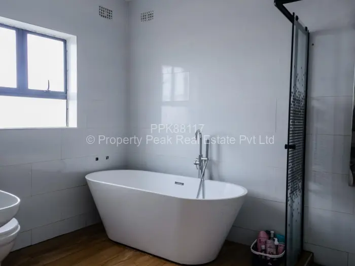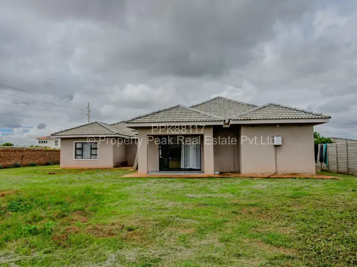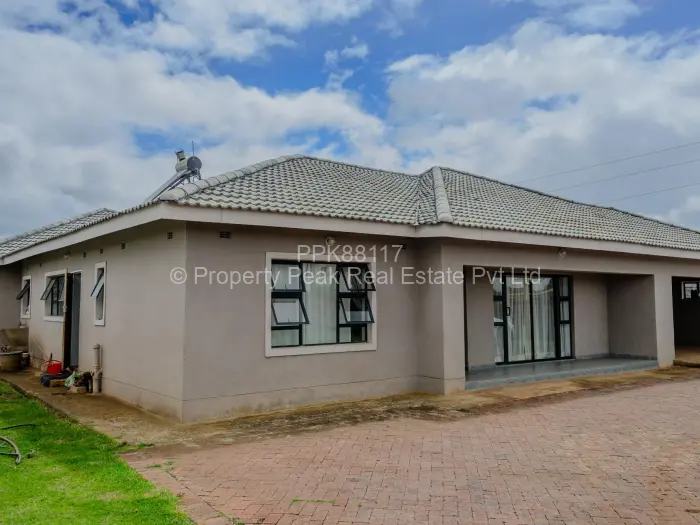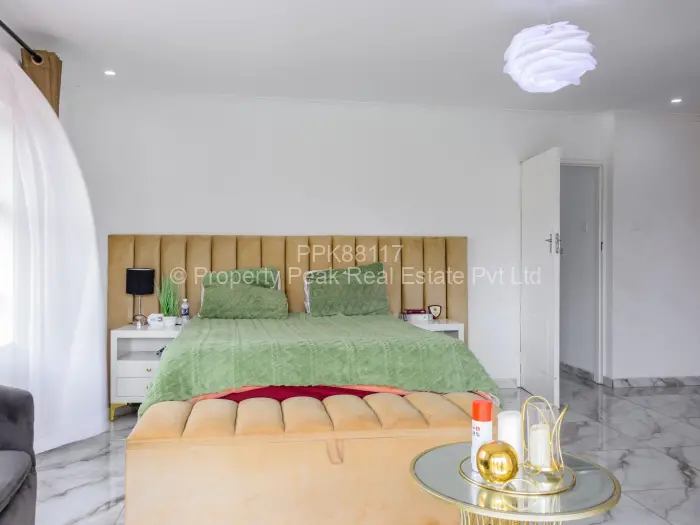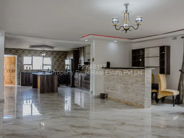 Stylish single-storey family home in sought-after Mt Pleasant Heights, Harare West 5 bedrooms, 4 bathrooms on a generous 1,800 m stand with a comfortable 300 m of living space. Approached by a paved driveway and covered parking, the property sits on a manicured lawn with room for a pool or extension. The bright, open-plan living and dining area features glossy tiled floors, elegant chandeliers and seamless flow into a modern kitchen fitted with dark built-in cabinetry and a breakfast island ideal for entertaining. The master suite includes an en-suite bathroom with a full bath, while additional bedrooms are well sized. Large windows and sliding doors bring abundant natural light and connect indoor spaces to the covered veranda and garden. Practical additions include a reliable borehole for water, walled and gated.